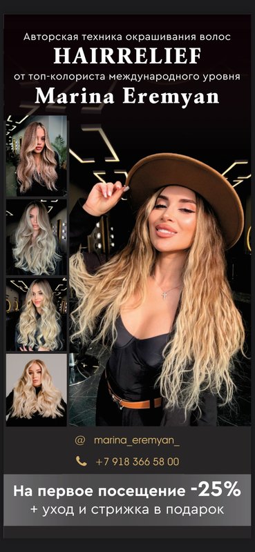 Марина Еремян-это профессионализм и эстетика во всем! После того как я попала в её золотые руки мои волосы из безжизненной, пережженной и местами отломанной соломы превратились в шелковистые волосы с благородным окрашиванием, которое деликатно отрастает. Сказать что я счастлива ни сказать ничего! Мариночка прекрасная красивая девушки и непревзойденный мастер своего дела!❤️❤️❤️